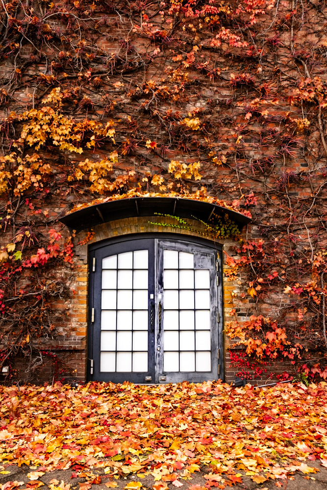 札幌を訪れたとき、街の一角でこの扉に出会いました。煉瓦の壁一面を覆っていた蔦は、赤や橙に色づき、今まさに最も美しい瞬間を迎えていましたが、同時にそれが「もうすぐ見納め」であることも感じさせる光景と空気の温度でした。間もなく訪れる厳しい冬を前に、蔦は役目を終え、この扉は次の季節へ開かれて行く、その境目に立ち会ったような気がしました。鮮やかな色彩と、これから訪れる静寂。その両方を抱え込むように、この扉は「冬への入口」としてそこに佇んでいました。